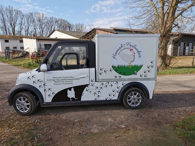 Rodzinie zależało na posiadaniu pojazdu z napędem elektrycznym, dlatego ARI całkowicie zastąpił dziś VW T5 Busa. Silnik spalinowy obecnie nie jest już używany i ma zostać sprzedany. Rolnicy mogą ładować ARI bezproblemowo i ekologicznie bezpośrednio obok stacji pakowania jaj za pomocą paneli słonecznych. Oprócz użytku w gospodarstwie, ARI służy również do codziennych podróży i zakupów. Tylko w przypadku przewożenia więcej niż 2 osób sięgają po większy pojazd. Dzięki zaczepowi holowniczemu rodzina Ullius może również używać ARI z przyczepą na swojej posesji i wygodnie przewozić materiały do budowy swoich pastwiskowych ogrodzeń w odpowiednie miejsca. Naszym klientom podoba się również zawieszenie, które pozwala na bezproblemową jazdę po drogach polnych nawet z ARI 458. Elektryczny transporter nie ma również problemów z poruszaniem się po trawie, dzięki czemu rodzina zawsze dotyka swoje przenośne kurniki w pełni elektrycznie.